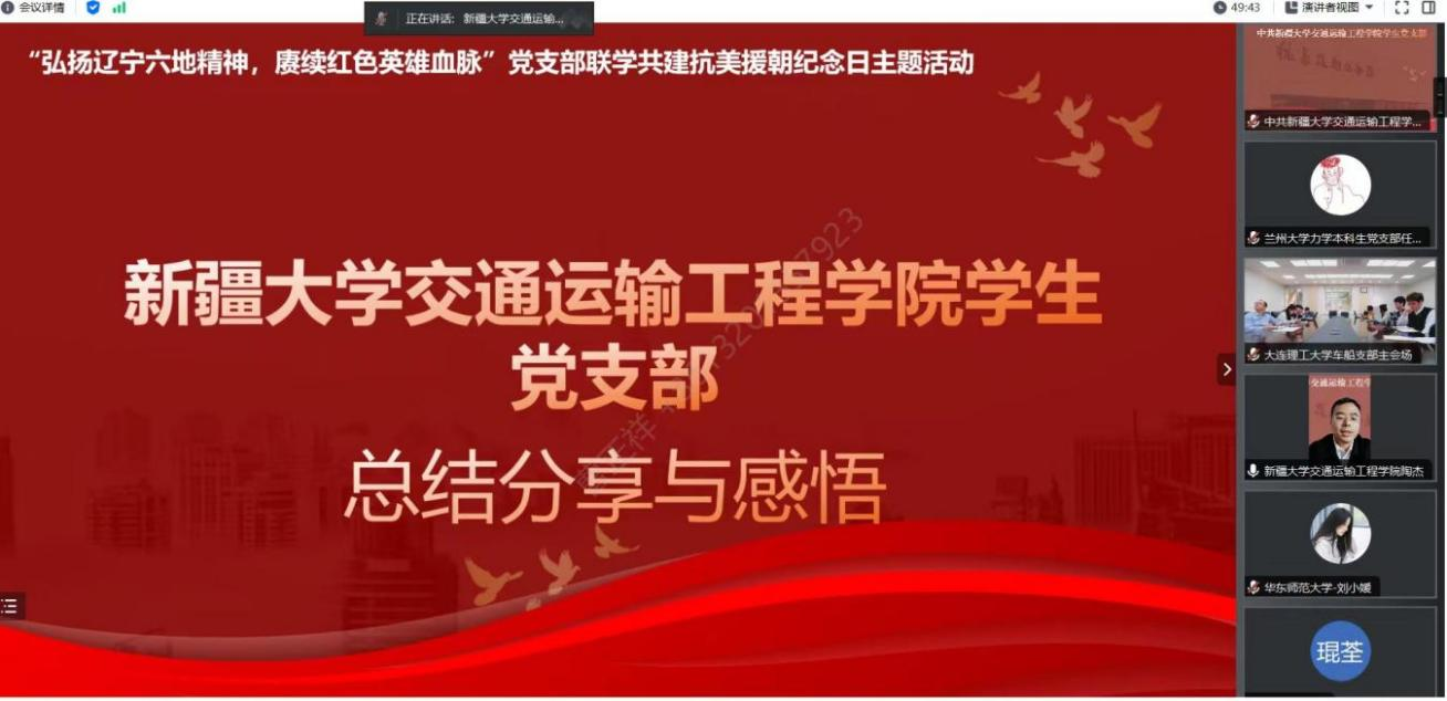 活动伊始,中国人民大学、中央民族大学、华东师范大学、浙江大学、兰州大学、新疆大学、四川大学、重庆大学、国防科技大学、大连理工大学依次介绍了参会学生党支部的情况,分享交流了支部建设的心得体会。会上,大连理工大学车船本科生辅导员纵向党支部进行线上分享,围绕“抗美援朝的出征地——辽宁丹东等辽宁六地红色精神”主题,讲述微党课致敬“最可爱的人”——中国人民志愿军;讲述了抗日战争的起始地——辽宁沈阳、解放战争的转折地——辽宁锦州、中国国歌素材地——辽宁桓仁、雷锋精神发祥地——辽宁抚顺等地的红色故事。活动后由参与共建的各高校党支部进行线上总结感悟。